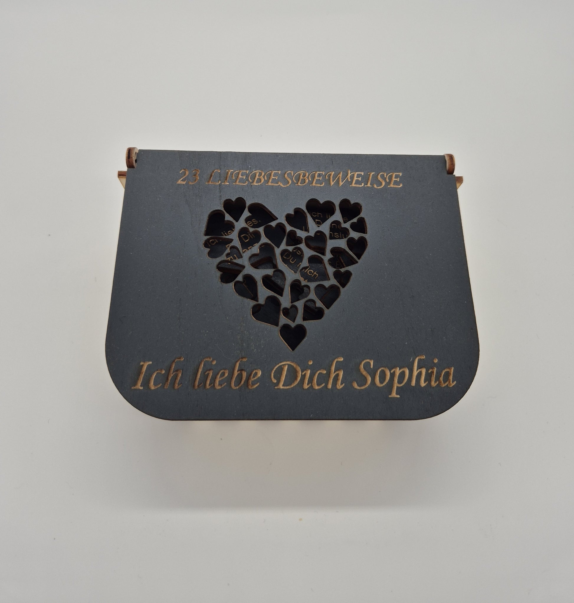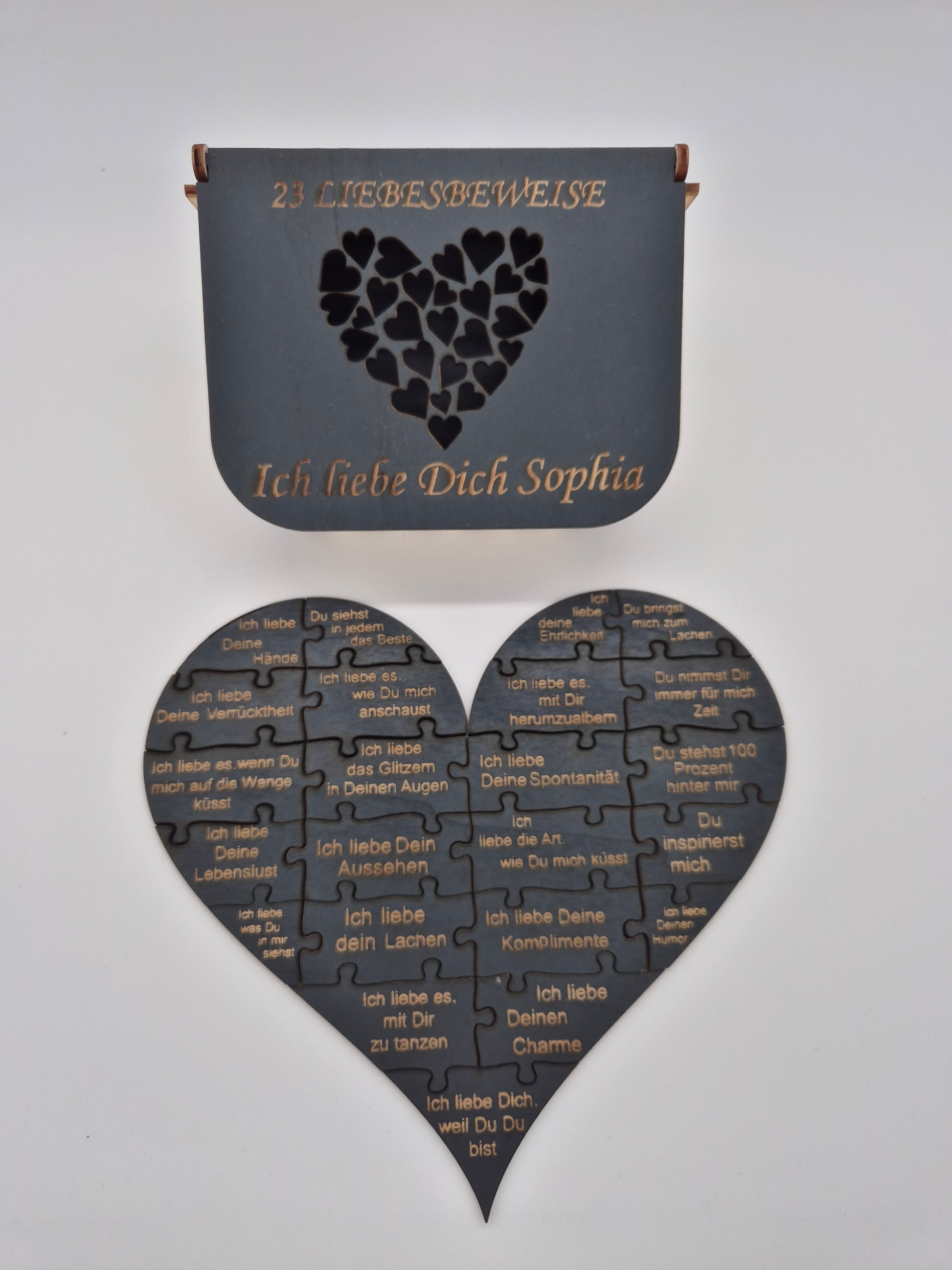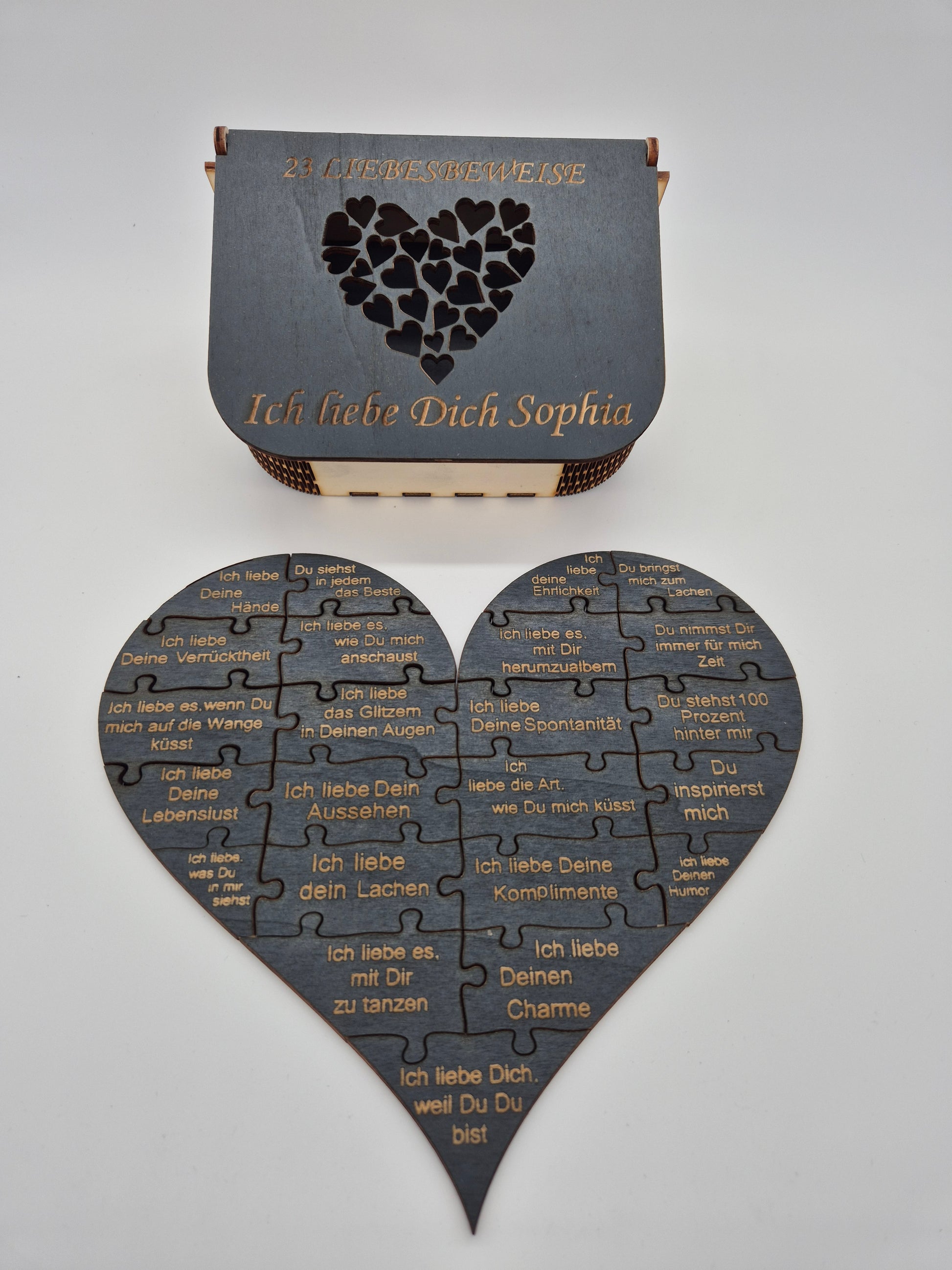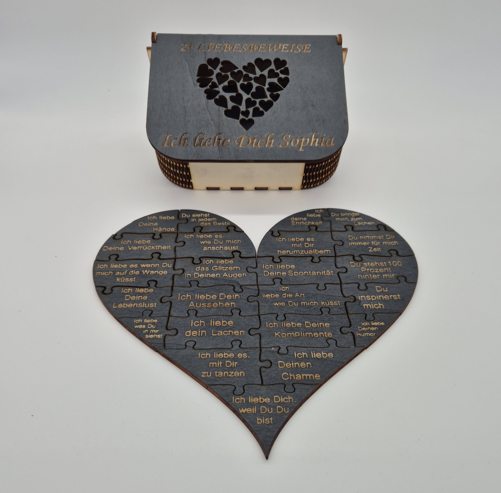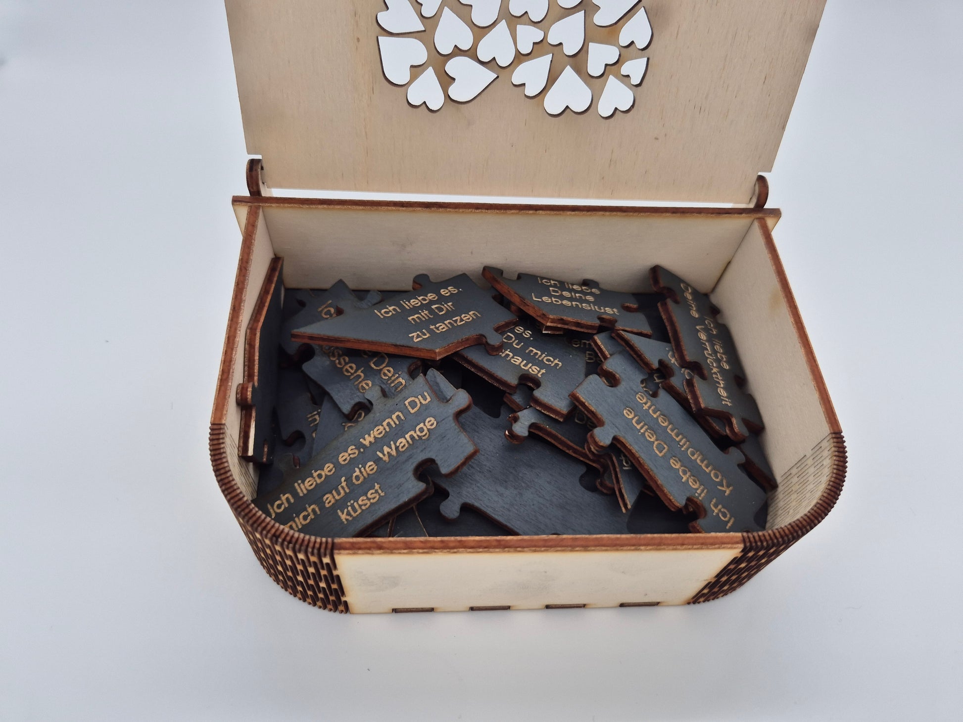Dieses hochwertige Holzpuzzle für Verliebte verbindet Spielspaß mit besonderen Emotionen. Mit liebevollen Botschaften wird das Zusammensetzen zu einem gemeinsamen Erlebnis, das Nähe und Freude fördert. Ideal, um Ihrem Partner auf originelle Weise Zuneigung zu zeigen und gemeinsame Momente wertvoll zu gestalten.